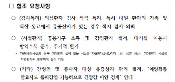의료진의 감염이 발생되지 않도록 ▲감염의심 증상 시 검사, ▲기구 소독, 손 소독, 환기 등의 감염관리를 철저 ▲마스크 착용, 방문자 명부 작성 및 체온측정 등의 방역수칙을 준수해주실 것을 당부드립니다.