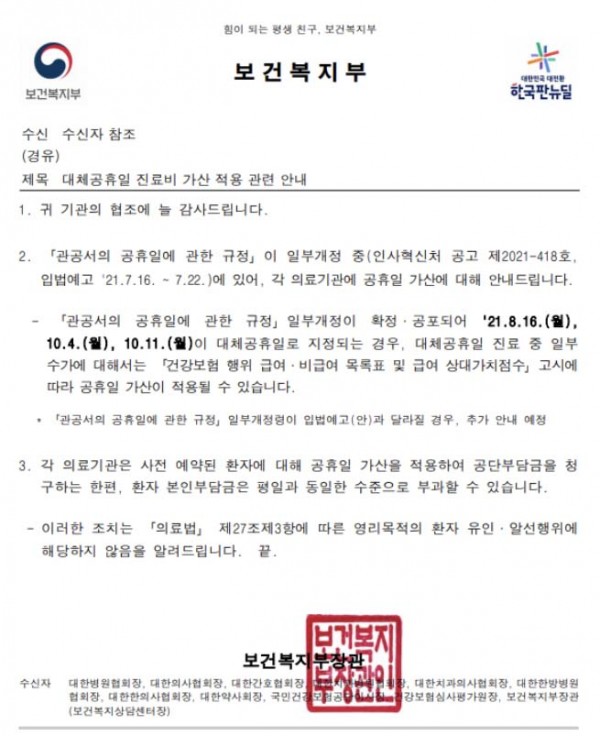 - 3·1절, 광복절, 개천절, 한글날 등 신설 '대체 공휴일' 기본진찰료 30% 가산