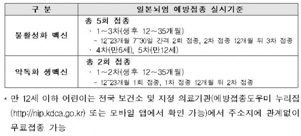 * 일본뇌염 예방접종을 희망하는 성인의 경우, 의료기관에서 유료접종(접종 백신 및 횟수 등은 의사와 상담 후 결정)