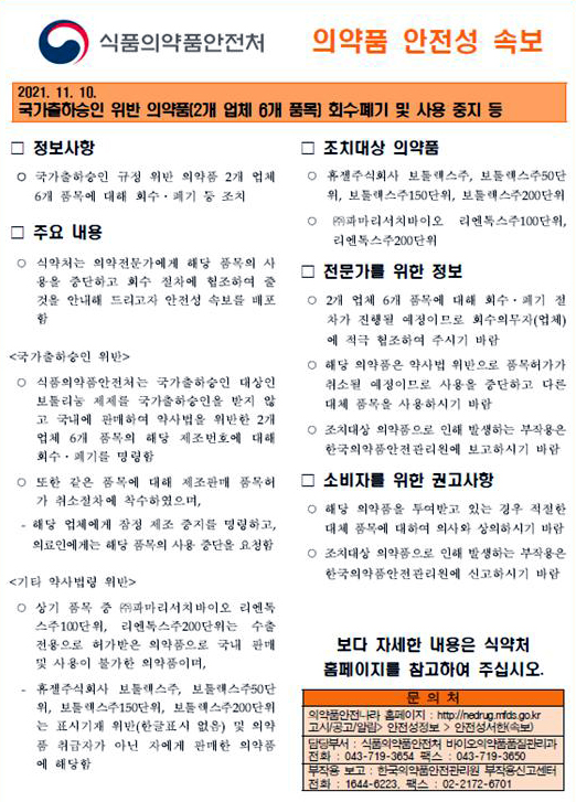 □ 식품의약품안전처(처장 김강립)는 휴젤주식회사, ㈜파마리서치바이오 2개 업체가 국가출하승인을 받지 않고 보툴리눔제제 6개 품목을 국내에 판매한 사실을 위해사범중앙조사단에서 적발하고, 해당 품목에 대한 품목허가 취소 등 행정처분과 회수·폐기 절차를 11월 10일 착수했습니다.