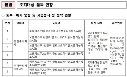 - 식약처에서 각 의료기관에 보툴렉스 '판매중지 및 사용중지'에 대한 공문 발송