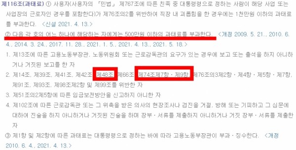 (제116조 2항에서는 '500만원 이하 과태료를 부과')