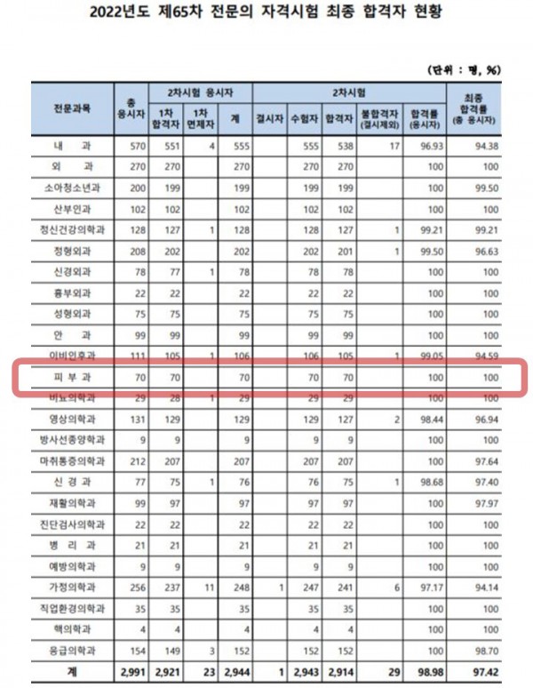 2022년도 피부과 전문의 70명 최종합격 (합격율: 100%)
