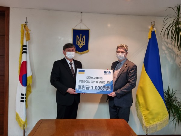 대한의사협회(회장 이필수)는 전쟁으로 어려움에 처해 있는 우크라이나 국민들을 응원하기 위해 7일 오후 주한 우크라이나 대사관을 통해 성금 1천만원을 전달했다고 밝혔다. 의협은 “삶의 터전이 파괴되고 수많은 민간인과 어린이들이 희생되고 있는 우크라이나의 안타까운 현실에서, 조금이나마 힘을 보태고자 인도적 지원 성금을 전달하게 되었다”고 취지를 밝혔다.