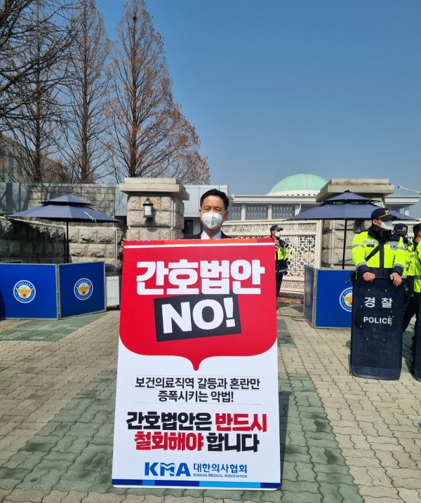김지훈 부회장은 “직역간 갈등을 일으키고 보건의료체계의 혼란을 초래해 결국 국민의 생명과 건강에 부정적인 영향을 미칠 것이 분명한 법안인 간호단독법에 반대하고자 1인 시위에 참여하였다”고 밝혔다.