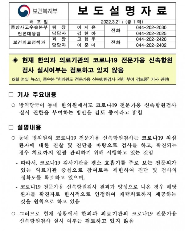 - 3월 21일 뉴스1, 중수본 “한의원도 전문가용 신속항원검사 권한 부여 검토중” 기사 관련
