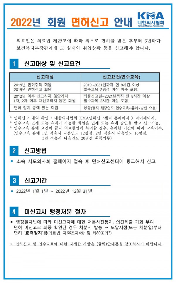 의료인은 의료법 제25조(신고)에 따라 최초로 면허를 받은 후부터 3년마다 보건복지부 장관에게 그 실태(연수교육 이수여부)와 취업상황 등을 신고해야 함.