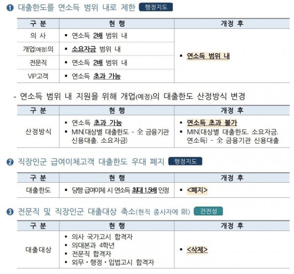 뿐만 아니라, 전문직 대상 '마이너스통장 대출' 한도도 기존보다 5천만∼1억원가량 줄어든다.
