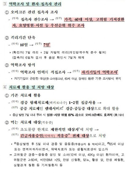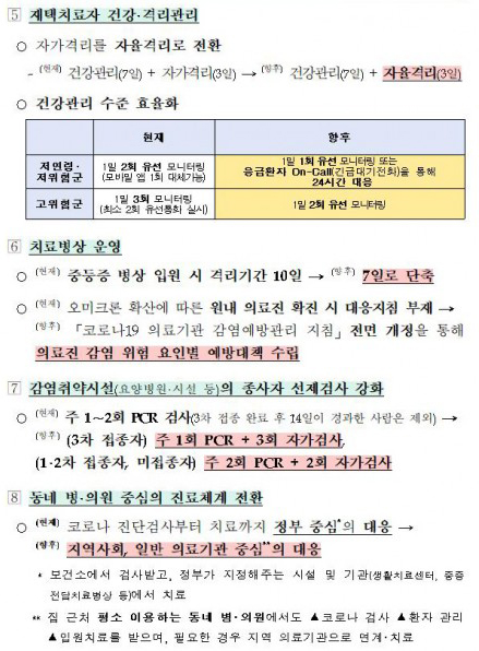 진료체계 개편 시기는 ▴오미크론 점유율 ▴중증화율 ▴확진자수 ▴예방접종률을 종합 고려하여 결정하며, 진료체계 전환을 위해서는 경증 코로나 환자는 지역 내 1차 의료기관에서 진료‧치료가 가능하다는 국민과 의료인의 인식전환이 필요하다.
