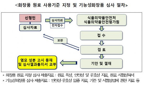 - 만약 기존에 염모제 성분으로 고시에 등재되어 있지 않은 신규 염모 성분을 사용할 경우 심사와 동시에 등재절차를 진행하면 됩니다.