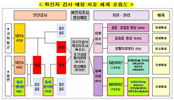 * 집중관리군은 재택치료관리의료기관에 배정하여 모니터링, 일반관리군은 보건소에서 현재증상, 기저질환등 건강상태를 확인 후 비대면 진료 등 재택치료 시의 의료상담법을 안내