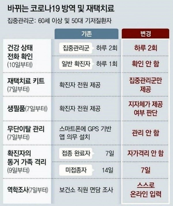 - 자기기입식 확진자조사서 도입, 자가격리앱 폐지, 격리제도 대폭 간소화 및 공동격리자 외출 허용 등