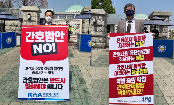 5월 3일 1인 시위에 참여한 김이연 의협 홍보이사는 “간호단독법은 원팀으로 일하는 보건의료현장을 고려하지 못한 악법 중의 악법이다. 코로나19가 종결되지 않은 상황에서 간호법 제정은 보건의료 직역 간 갈등을 유발해 국민에게 악영향을 미칠 우려가 크다. 어려운 위기를 극복하기 위해서는 특정 직역을 위한 독립 법률 제정이 아닌 현행 의료법과 보건의료인력지원법을 보완해 전체 보건의료인의 처우를 개선할 수 있는 방안을 강구해야 한다”고 강하게 주장했다.