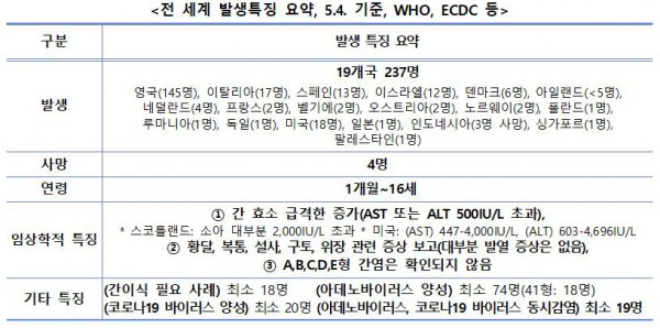 ○ 영국의 최초 보고(4.5.)를 시작으로 일부 유럽 국가와 미국, 일본 등 19개국에서 총 237명 발생하였고 4명 사망하였다(~5.4.).