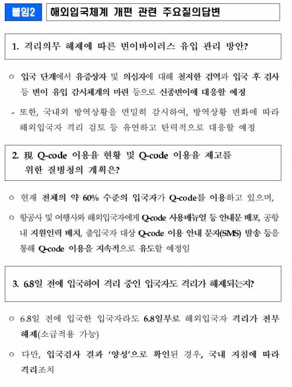 - 6.8일 전에 입국한 입국자에 대해 소급적용 되어 6.8일부로 해외입국자 격리가 전부 해제되나, 입국검사 결과 ‘양성’으로 확인된 경우, 격리 조치 된다.