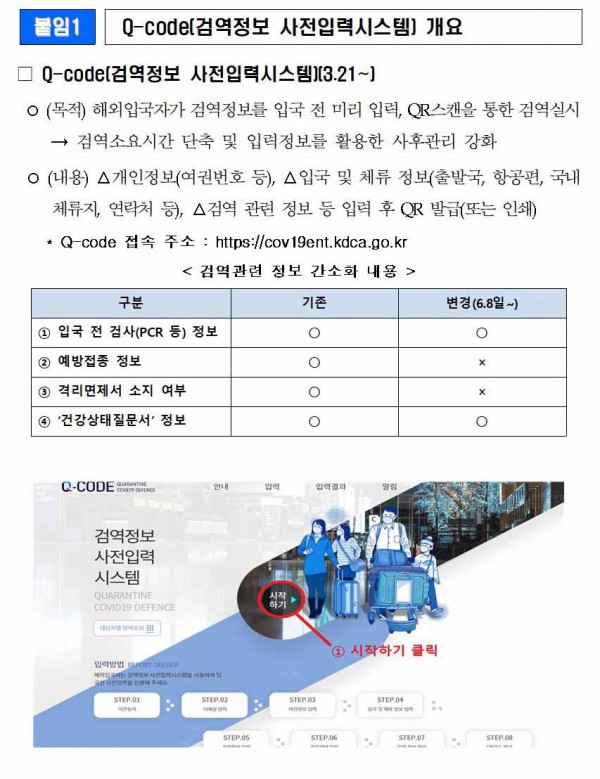 * (기존) 입국 전 검사(PCR 등) 정보, 건강상태질문서 정보, 예방접종정보, 격리면제서 정보 입력 → (변경) 입국 전 검사 정보, 건강상태질문서 정보만 입력
