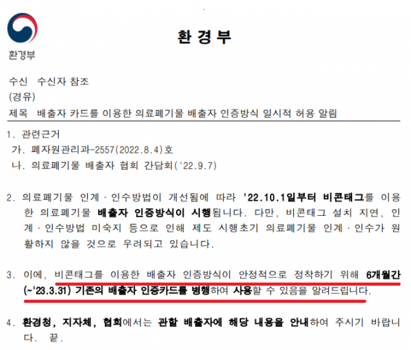 [환경부]기존 ‘배출자 인증카드’를 이용한 의료폐기물 배출자 인증방식 일시적 허용(비콘태그 6개월 유예, 23.3.31.까지)