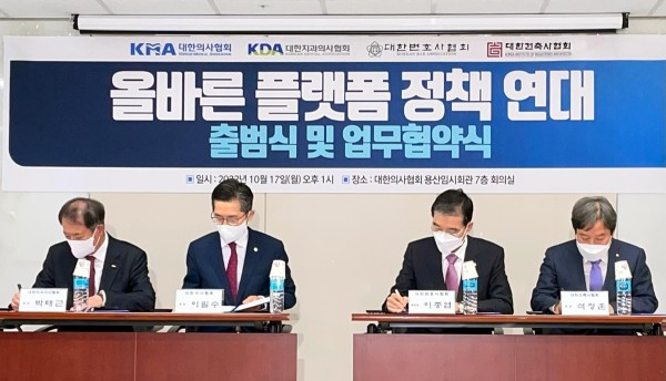 대한의사협회(회장 이필수)는 대한치과의사협회, 대한변호사협회, 대한건축사협회와 17일 플랫폼 기업에 공동으로 대응하기 위한「올바른 플랫폼 정책 연대」출범식 및 업무협약식을 개최했다.