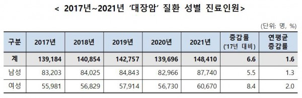 □ 국민건강보험공단(이사장 강도태)은 건강보험 진료데이터를 활용하여 2017년부터 2021년까지 ‘대장암(C18~C20)’ 질환의 건강보험 진료현황을 발표하였다.