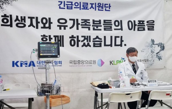 한편 10월 31일 오후 이필수 의협 회장에 이어 같은 날 저녁에는 이정근 의협 상근부회장이 나서 늦은 밤까지 합동분향소를 찾은 조문객들을 지원한 바 있으며, 진료소 운영 기간 동안 긴급의료지원단 의료진들의 의료지원 활동이 지속될 예정이다.