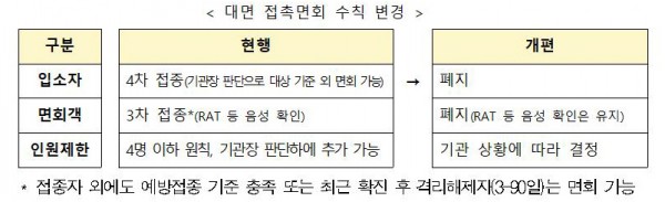 - (접촉면회) 면회대상 및 인원 제한은 폐지하되 사전예약제, 면회 전 PCR 또는 신속항원검사 검사 실시, 음식물 섭취 금지 등 방역수칙은 유지