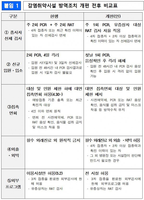 - (선제검사) 종사자는 주 2회 PCR 및 신속항원검사에서 주 1회 PCR로 축소, 신규 입원·입소자는 입원시 2회 PCR 실시 및 4일 격리에서 1회 검사 후   음성 확인 시까지만 격리하도록 개편