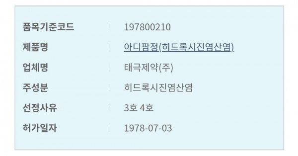 아디팜정(히드록시진염산염, 태극제약, 1978-07-03허가)이 식약처 의약품통합정보 시스템에 ‘생산/수입/공급중단 보고 대상의약품’으로 고시 되었습니다.