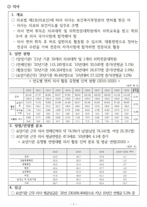 - (의사) ‘20년 47.9세로 ’10년 43.8세에서 평균연령 4.1세 증가