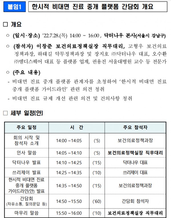 - 한시적 비대면 진료 중개 플랫폼 영업이 보건의료법령 및 보건의료질서를 저해하지 않는 범위 내에서 이루어질 수 있도록 마련한 「한시적 비대면 진료 중개 플랫폼 가이드라인(안)」 에 대한 의견과 함께 비대면 진료에 대한 업계 등의 의견을 청취하고자 간담회를 개최하였다.