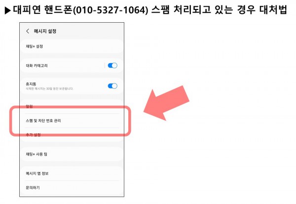※핸드폰 문자-->‘메시지 설정’-->스팸 및 차단 번호 관리-->들어가셔서 ‘대피연 핸드폰(010-5327-1064)’을 스팸처리 혹은 차단 해제 해 주셔야 합니다.