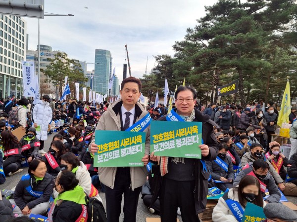 이날 전국에서 모인 보건복지의료연대 소속 회원들은 갑자기 내려간 영하의 날씨에도 간호법 제정 저지를 한목소리로 외쳤다.