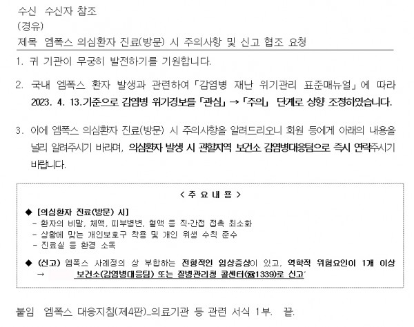 국내 엠폭스 환자 발생 증가로 인하여, 엠폭스 관련 진료(방문) 시 주의사항 및 신고 협조 요청 공문 송부드립니다.