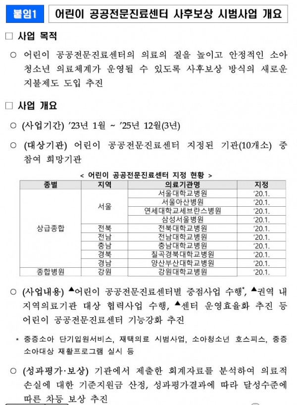 - 2023년 1월부터 어린이 공공전문진료센터 사후보상 시범사업 착수
