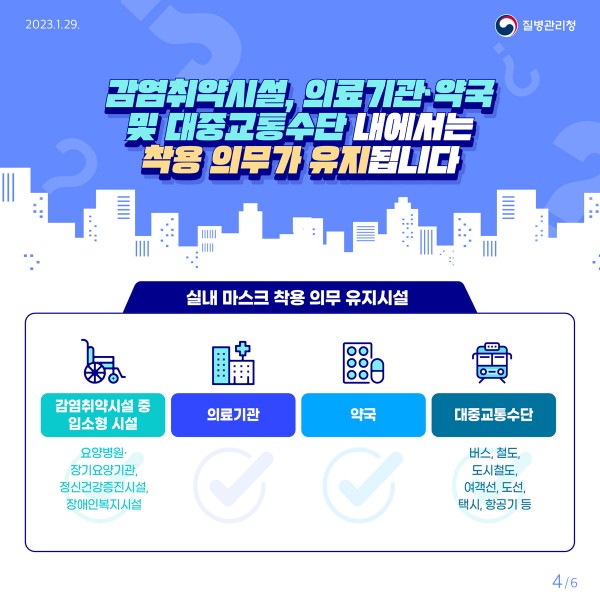 [질병청]1월 30일부터 실내 마스크 착용 ‘권고’로 전환 (감염취약시설, 의료기관·약국 및 대중교통수단 착용 의무 유지)