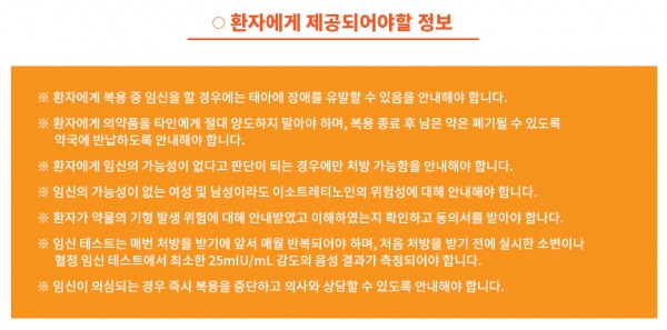 - 의·약사는 환자에게 기형 유발 위험성, 피임기간 및 방법에 대해 설명하여야 함.