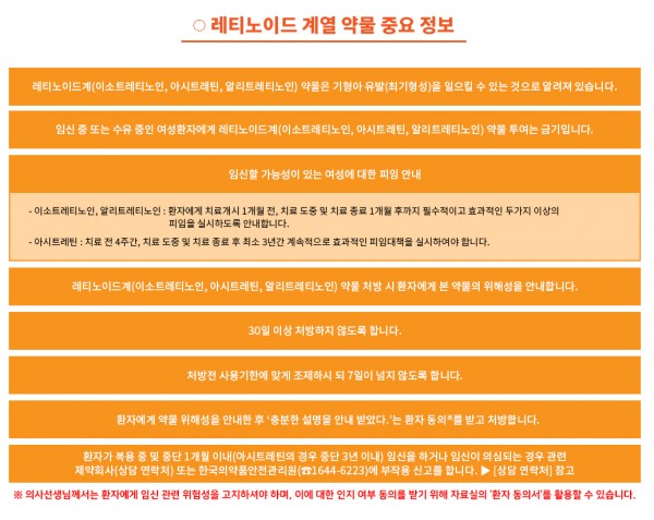 * 성분명(효능): 이소트레티노인(중증 여드름), 알리트레티노인(손 습진), 아시트레틴(건선)