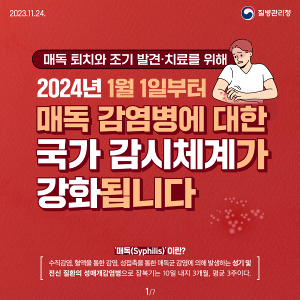 [질병청]2024년부터 매독에 대한 국가 감시체계가 강화(3급 감염병, 전수검사, 조기잠복.3기매독도 신고) 대피연 메일보내기 이름으로 검색 0 10,566 2023.11.30 11:42 첨부파일 - 첨부파일: 01.png (965.0K) 84 - 첨부파일: 02.png (747.8K) 64 - 첨부파일: 03.png (711.0K) 87 - 첨부파일: 04.png (714.3K) 104 - 첨부파일: 05.png (773.7K) 65 짧은주소 - 짧은주소: https://laserpro.or.kr:443/bbs/?t=cU5 주소복사 × 짧은 글주소 복사 Note! 위 주소를 드래그, 복사(Ctrl+C)하여 사용하세요. 이전글다음글 목록 본문 [질병청]2024년부터 매독에 대한 국가 감시체계가 강화(3급 감염병, 전수검사, 조기잠복.3기매독도 신고) 이전글다음글 목록 댓글목록 등록된 댓글이 없습니다.