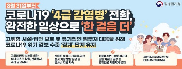 [질병청]8.31. 기점으로 코로나19 ‘4급 감염병’으로 전환 (고위험 시설·집단 보호를 위해 ‘경계’ 단계 및 실내 마스크 등 조치는 현행 유지)