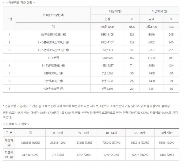 소득하위 50% 이하 대상자와 지급액은 각각 158만 7,595명, 1조 7,318억 원으로 전체 대상자의 85.0%, 지급액의 70.1%를 차지하여 본인부담상한제가 주로 소득 하위계층의 의료비 부담을 줄여준 것으로 확인되었다.