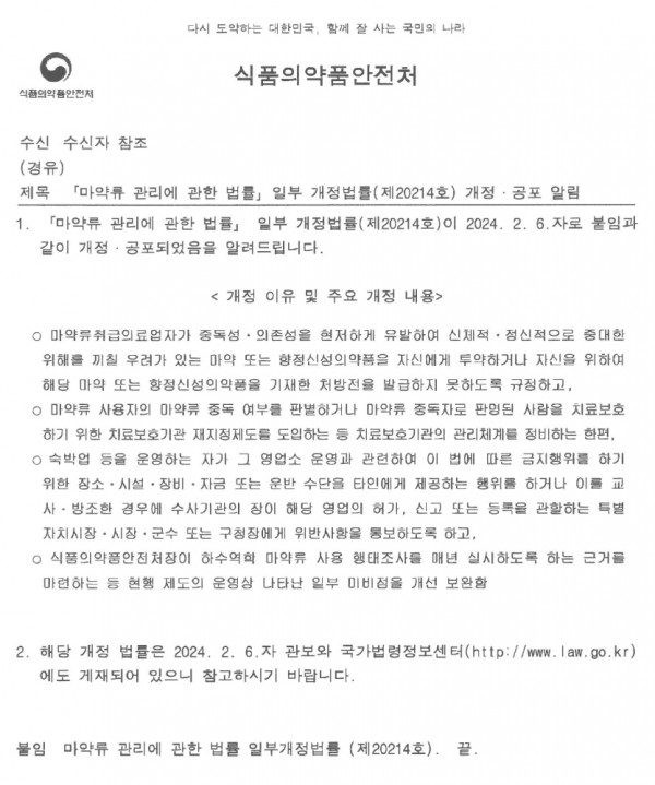 - 마약류 관리에 관한 법률 일부 개정법률(2024년 2월 6일)