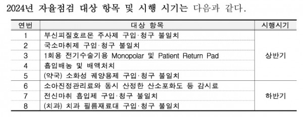 올해 시행할 자율점검 대상항목은 공정성, 객관성, 수용성을 제고하기 위하여 의약계가 참여한‘자율점검운영협의체’ 논의를 통해 ‘부신피질호르몬 주사제 구입.청구 불일치’ 등 총 8개 항목을 선정하였다.