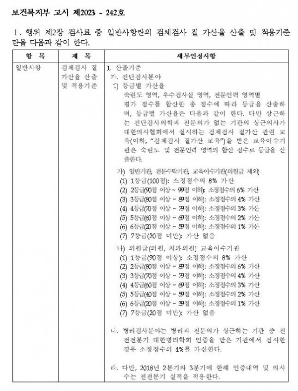 이는, 복지부 고시 제2023 – 242호에 따라서 검체검사 질 가산율 산출 및 적용 기준이 변경되어 2024년 1월 1일부터 시행되었기 때문입니다.