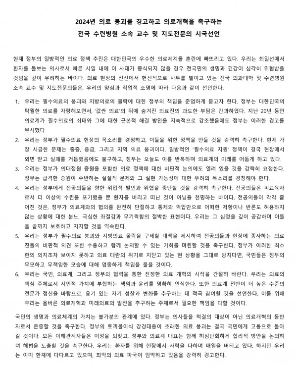 의료 위기에 대한 수련병원 교수/전문의 시국선언 연대서명을 요청드립니다.