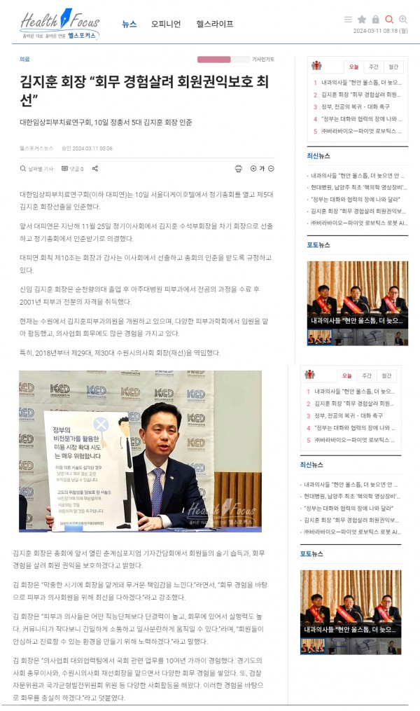 3월 10일 열린 대한임상피부치료연구회(이하 대피연) 정기총회에서 인준을 거쳐 제5대 회장에 취임한 김지훈 회장이 기자간담회에서 필수의료 패키지와 관련하여 이런 입장을 밝혔다.