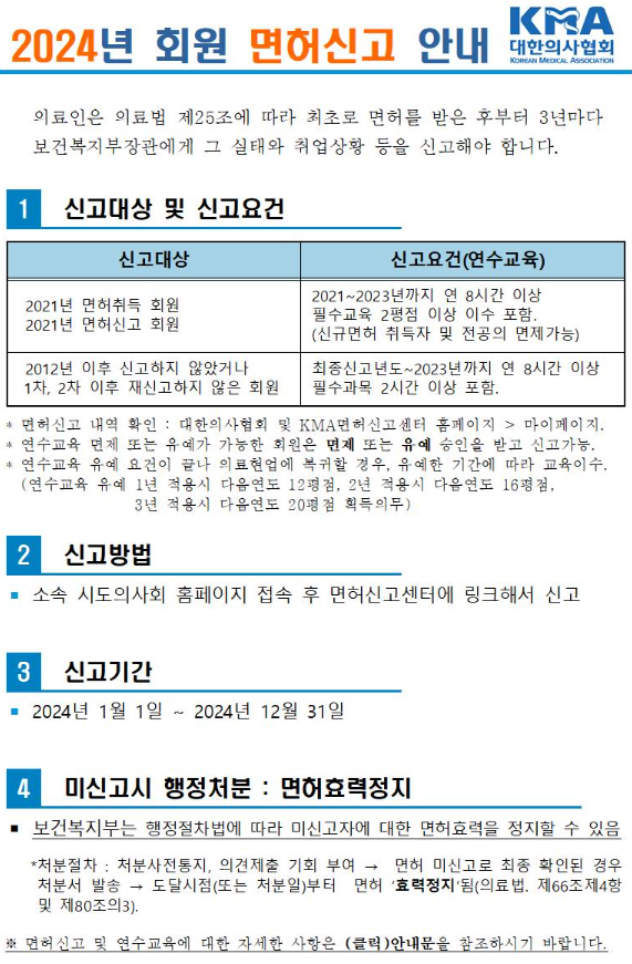 □ 면허신고 기간 : 면허 취득, 재교부 또는 신고일로부터 3년마다* 2024년 1월 1일 ~ 2024년 12월 31일(수리완료 기준)
