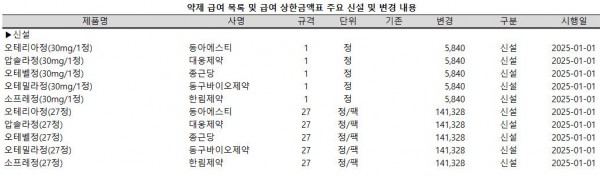 보건복지부는 2024년 12월 24일, 이와 같은 내용을 반영해 ‘약제 급여 목록 및 급여 상한금액표’를 일부 개정ㆍ발령했다.(보건복지부 고시 제2024-244호)