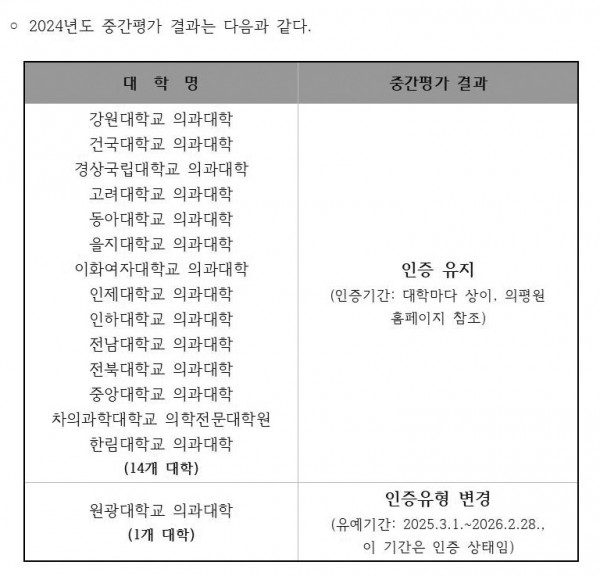 의평원은 2024년도 중간평가 결과 14개 의과대학·의학전문대학원은 모두 평가인증 및 인증유지 당시의 의학교육 현황을 적절히 유지하고 있다고 판단하여 ‘인증 유지’하기로 결정하였고, 1개 의과대학은 판정위원회 판정을 거쳐 인증유형을 변경하였다. 의평원은 인증유형이 변경된 대학을 2025년도 정기평가를 통해 재평가할 계획이다.