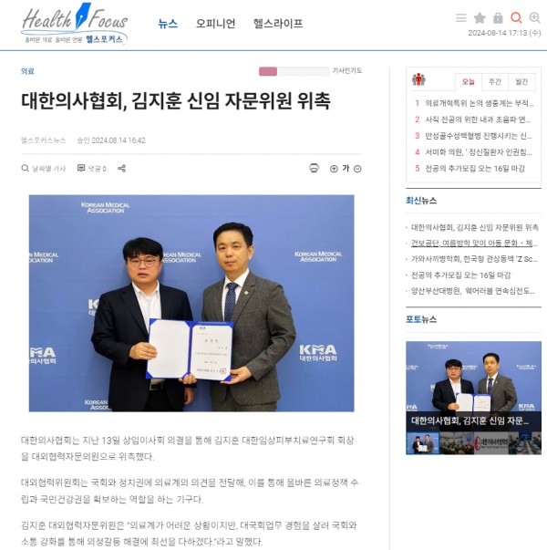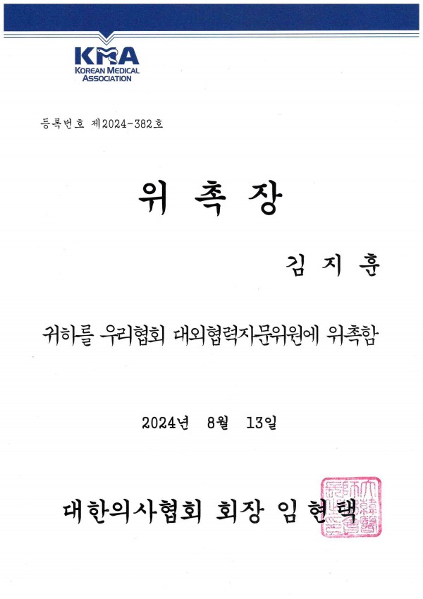 본 회 김지훈 회장이 2024년 8월 13일 제42대 대한의사협회(회장: 임현택) ’대외협력자문위원‘으로 위촉되었습니다(사진).