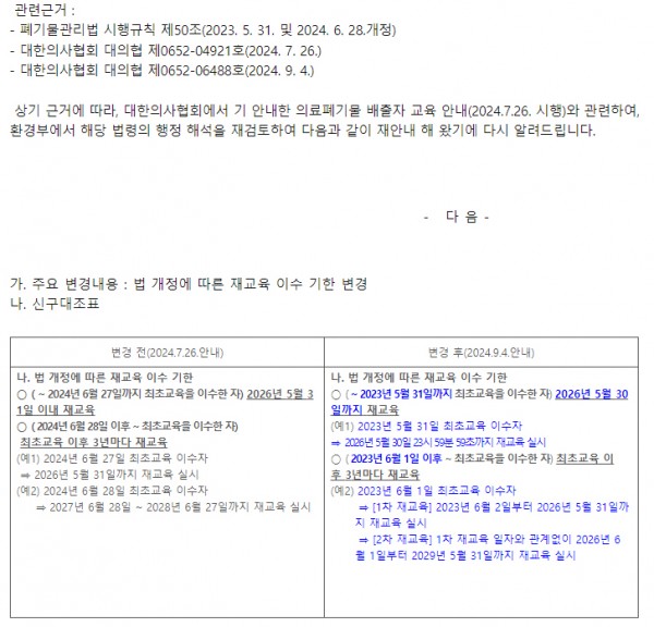 ※ 대한의사협회 회원(의사)이라면 우리협회 外 기관(한국폐기물협회, 한국환경보전원)에서 최초교육을 이수한 경우라도 재교육을 우리협회에서 이수 가능하도록 교육설계 예정임.