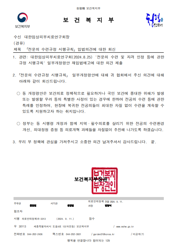 #첨부 1.[복지부 회신]‘전문의의 수련 및 자격 인정 등에 관한 규정 시행규칙’ 일부개정령(안) 재입법예고에 대한 대한임상피부치료연구회 의견서(2024.09.11.)